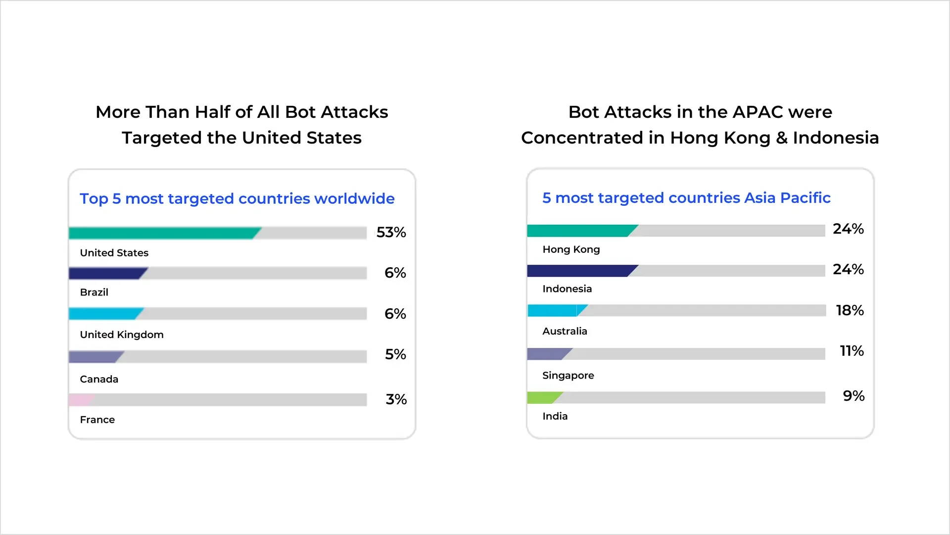 Within the APAC region, Hong Kong and Indonesia each recorded 24% of attacks, making them the most targeted locations. The data shows a clear pattern: economies with large digital footprints and a strong reliance on financial services tend to attract higher volumes of bot traffic. Markets like South Korea, where API-driven services are prevalent, are equally exposed to bot attacks.