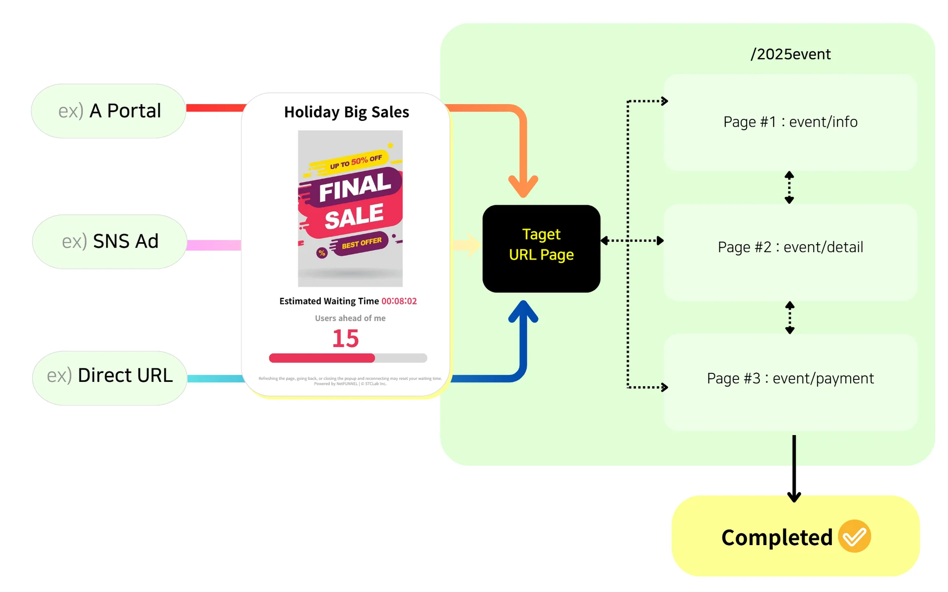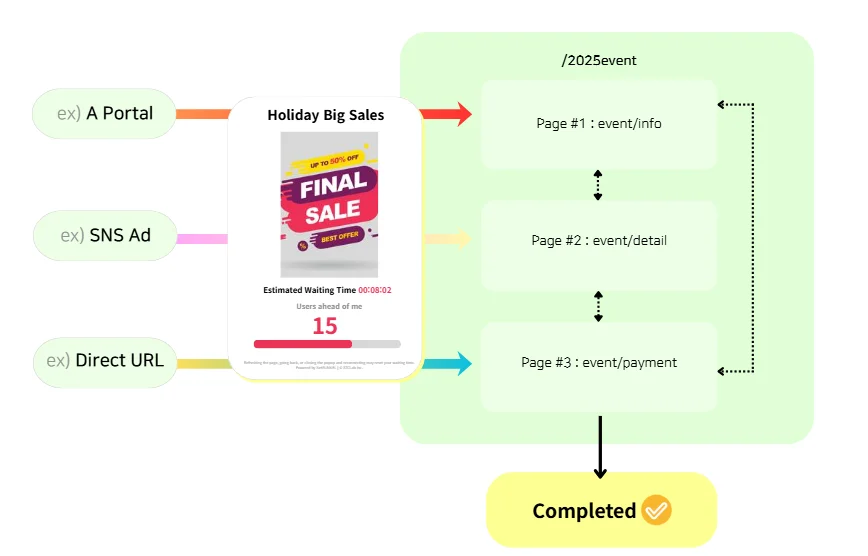 For example, if you have an event service whose URLs start with “/2025event”, you can apply NetFUNNEL to all related pages such as “/event/info”, “/event/detail”, and “/event/payment.” When any action triggers these pages to be displayed, a unified virtual waiting room is activated to manage queue order and entry control. And as users navigate between these pages, the Entry Pass prevents them from experiencing repeated waiting.